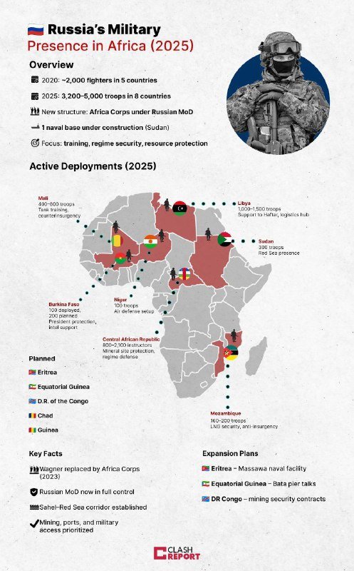 La Russia sta rafforzando in modo significativo la propria presenza militare nel continente africano, con un contingente che ha raggiunto tra i 3.200 e i 5.000 soldati distribuiti in almeno otto Paesi, rispetto ai circa 2.000 del 2020. Questo incremento si inserisce in una strategia più ampia volta a consolidare l’influenza di Mosca in aree chiave del continente, in particolare nel Sahel, nell’Africa centrale e ora anche nell’Africa occidentale. Le missioni russe si concentrano su tre obiettivi principali: protezione dei regimi alleati, lotta alle insurrezioni jihadiste e sicurezza dei siti strategici di risorse naturali, come petrolio, gas, uranio e coltan.